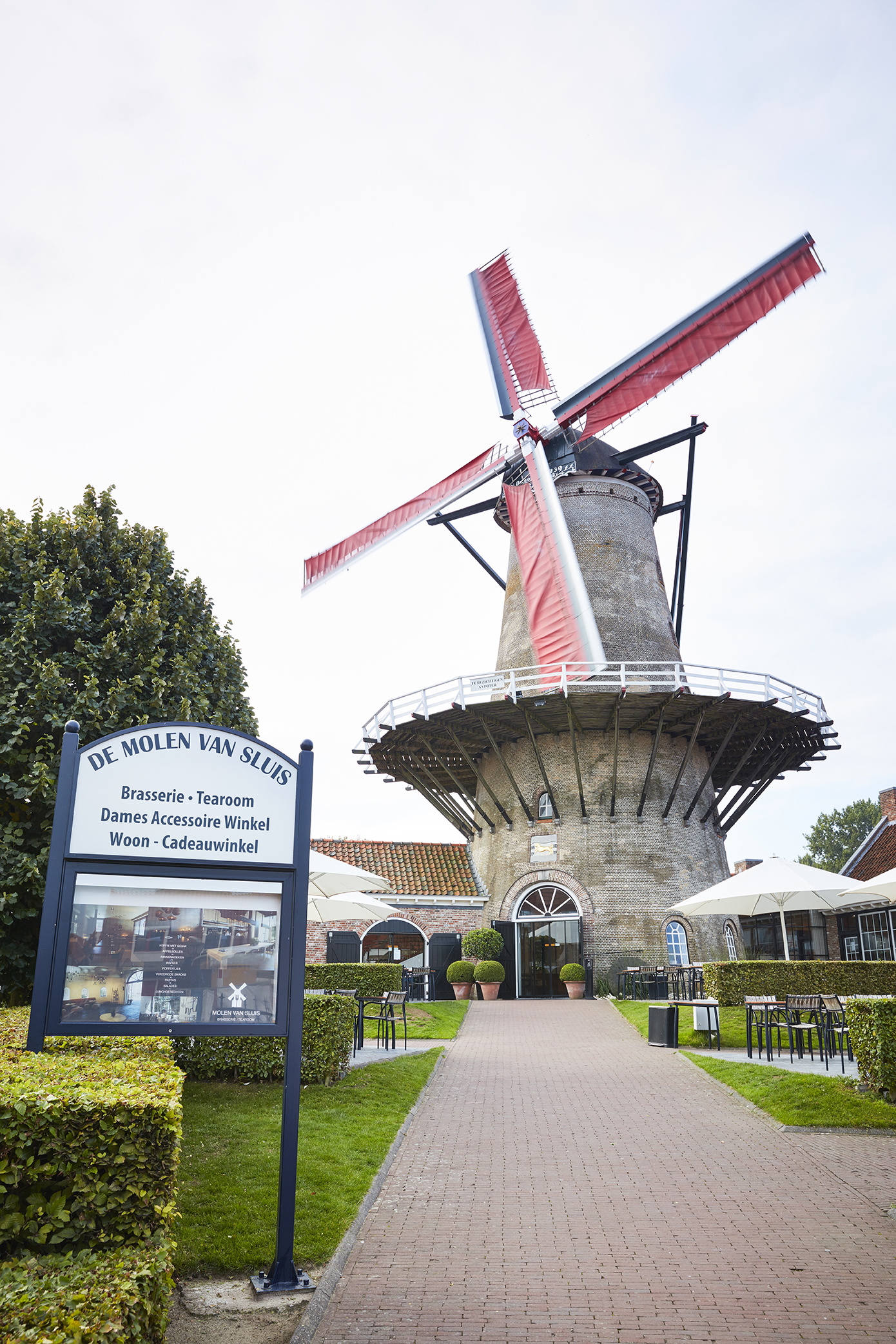 De molen is nog steeds actief en toegankelijk. Een bezoek beloont u met een panoramisch zicht over Sluis vanop de bovenstelling. Ons meel kunt u in de molen kopen. Het meel wordt gebruikt in onze brasserie voor het bereiden van lekkernijen! Ook een Hollands souvenirtje zoals een Delfts blauw molentje of een houten klompje is hier te koop.